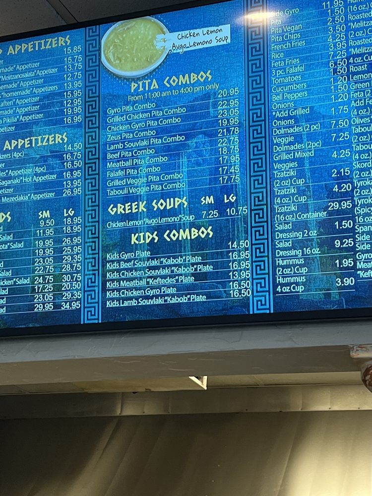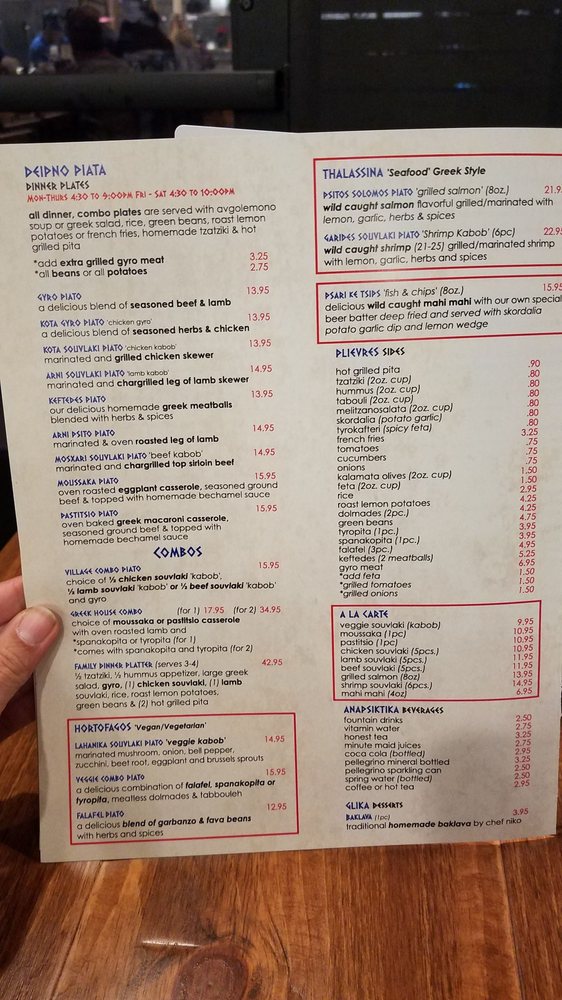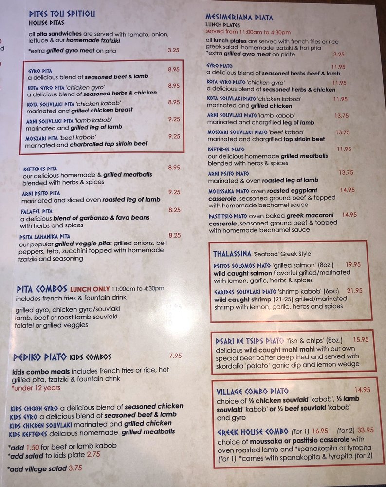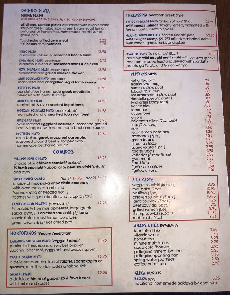Choice of Chicken Souvlaki Kabob, Lamb Souvlaki Kabob or Beef Souvlaki Kabob with Gyro meat and choice of soup or Greek House salad, rice, roast lemon potato or french fries. Also, comes with our traditional homemade green beans, grilled pita bread and (oz.) cup of tzatziki. / souvlaki stick is pc. large chunks of marinated and grilled meat.NOTE: PLEASE SELECT () SIDES ON YOUR DINNER PLATE. (i.e.) st SIDE CHOICE; select SOUP or SALAD, then nd SIDE CHOICE IS RICE, POTATOES or FRENCH FRIES. GREENBEANS DO COME AUTOMATICALLY. HOWEVER, IF YOU CHOOSE ONLY () SIDE, YOU WILL GET DOUBLE PORTION OF SIDE SELECTED WHICH CANCELS OUT GREEN BEANS. NO SUBSTITUTES Please see sides for Additional Sides